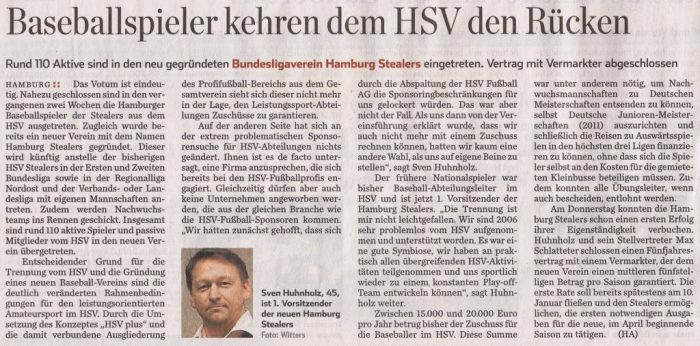 Pressestimme aus dem Hamburger Abendblatt vom 21.11.2014 zum Austieg der Stealers beim Hamburger Sportverein HSV und zur Neugründung des Baseballclub…