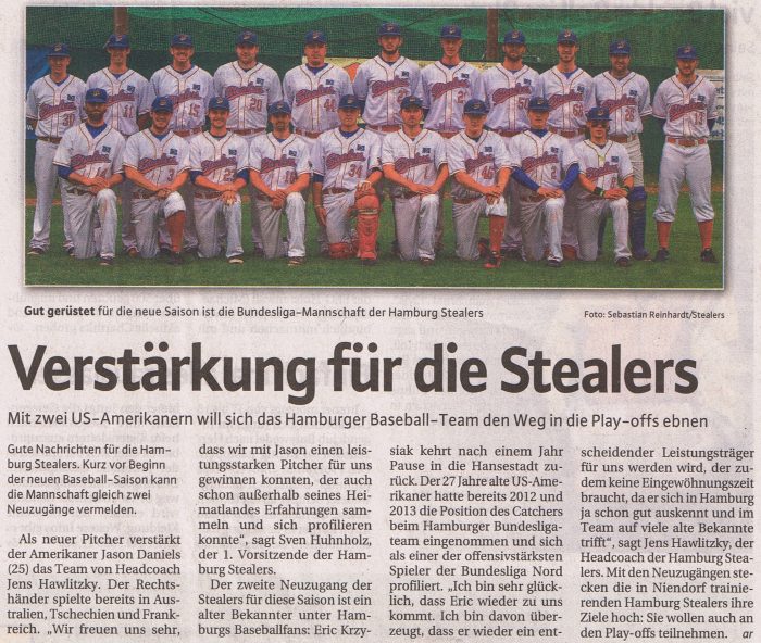 Pressestimme aus dem Niendorfer Wochenblatt vom 13.3.2015 zu Verstärkung der Stealers zum Saisonbeginn.