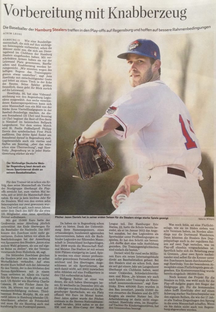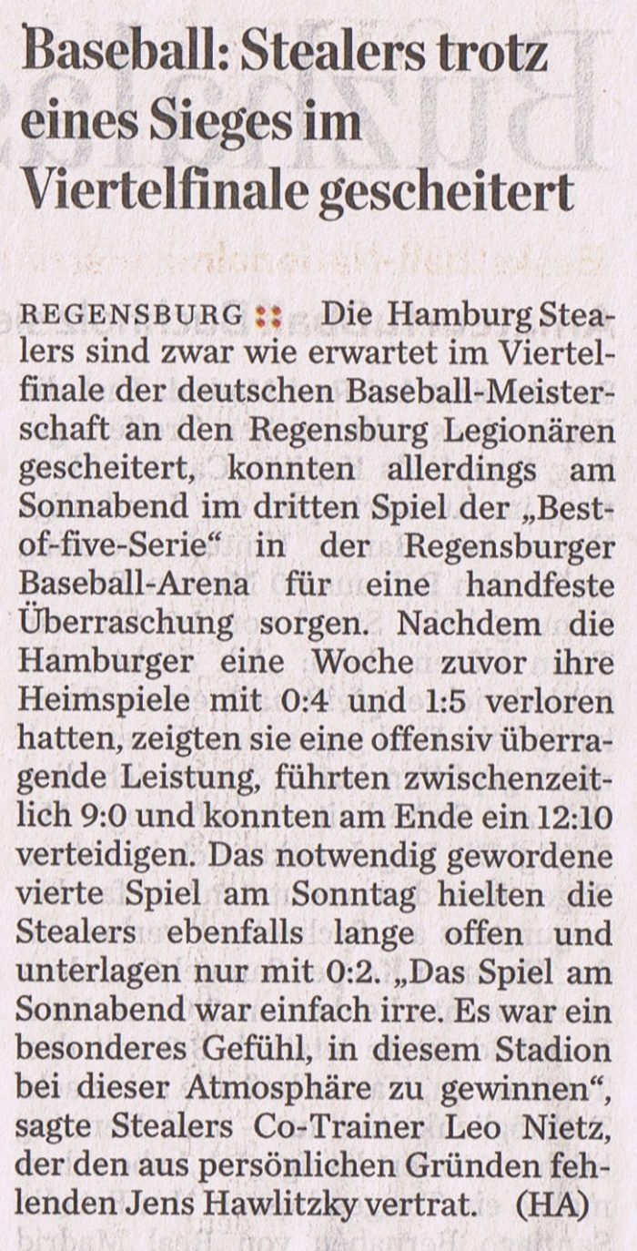Nach zwei interessanten Spielen des Play-off-Viertelfinales um die Deutsche Baseball-Meisterschaft mussten sich die Hamburg Stealers am Wochenende jeweils relativ knapp…