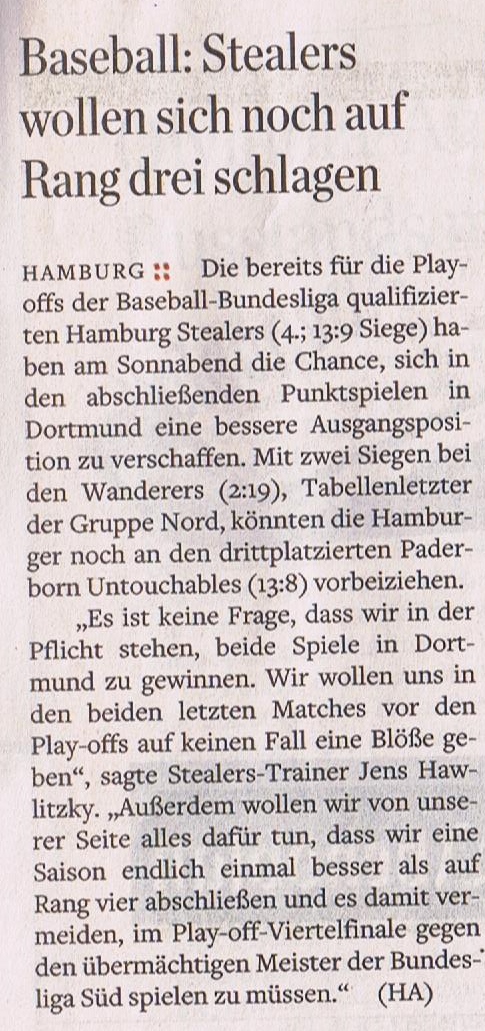 Nach einem spielfreien Wochenende bestreiten die bereits für die Play-offs qualifizierten Hamburg Stealers an diesem Sonnabend (13 und 15.30 Uhr)…