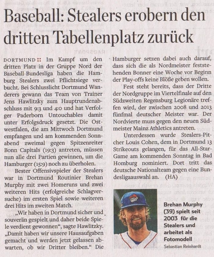 Trotz erheblicher personeller Probleme konnten sich die Hamburg Stealers im Spitzenduell der Baseball-Bundesliga Nord gegen die als Tabellenzweite angereisten Solingen…