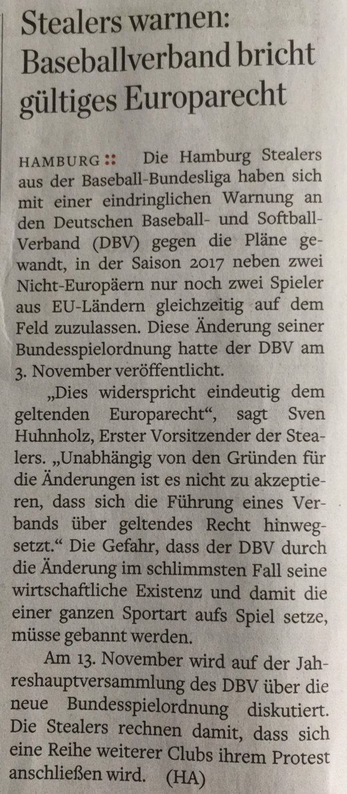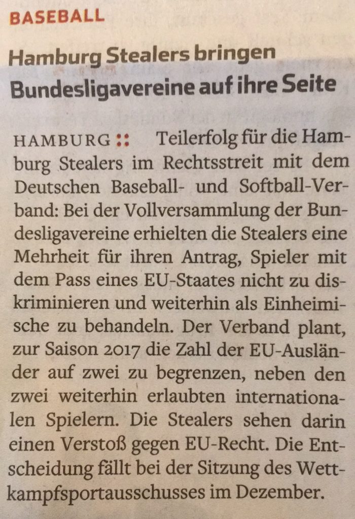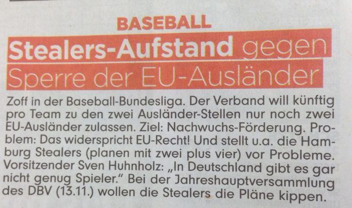 Sportler aus allen EU-Mitgliedstaaten sind generell im europäischen Mannschaftssport gleichgestellt. Deshalb sind die Hamburg Stealers – Norddeutschlands größter Baseballverein –…