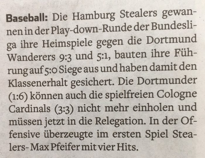 Die Hamburg Stealers haben die Play-down-Runde der Baseball-Bundesliga mit einem Split bei den Cologne Cardinals (5:2 und 0:3) am Sonnabend…