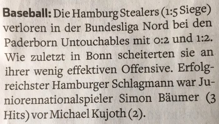 Zwei knappe und vermeidbare Niederlagen mussten die Hamburg Stealers am Sonnabend in der Baseball-Bundesliga bei den Paderborn Untouchables mit dem…