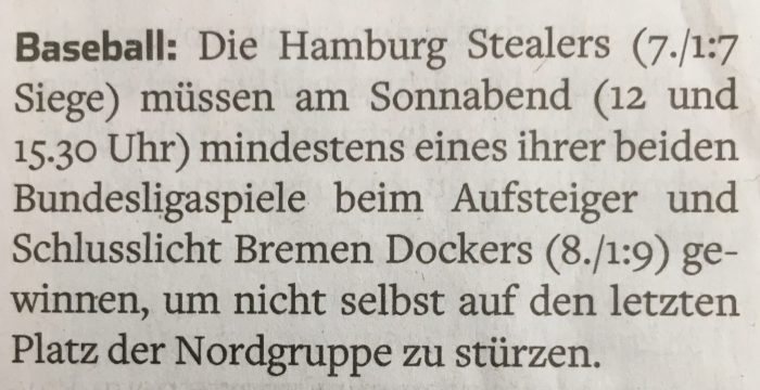 Die Hamburg Stealers kamen am Sonnabend bei ihren beiden Auswärtsspielen in der Baseball-Bundesliga Nord bei den Bremen Dockers zu einer…