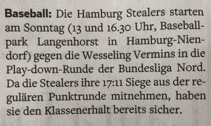Die Hamburg Stealers haben dank einer starken Offensive ihre beiden Spiele der Play-down-Runde in der Baseball-Bundesliga Nord gegen den Tabellenletzten…