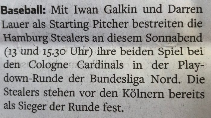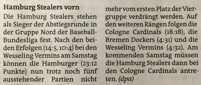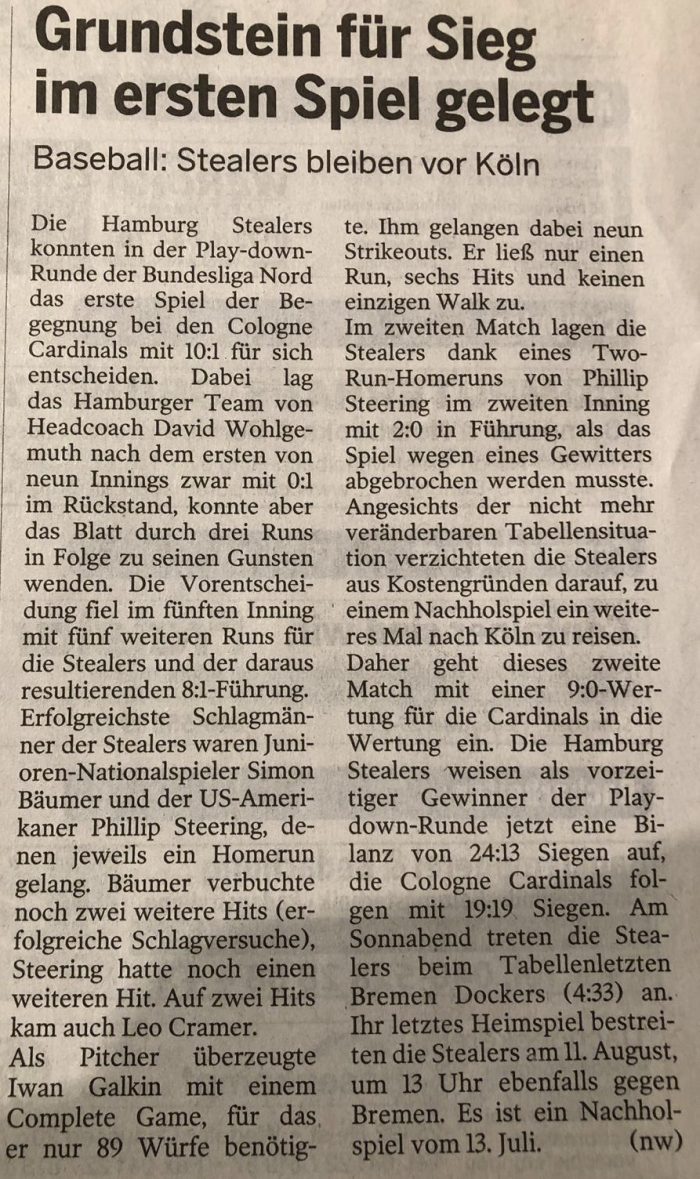Die Hamburg Stealers konnten in der Play-down-Runde der Bundesliga Nord das erste Spiel der Top-Begegnung bei den Cologne Cardinals überzeugend…