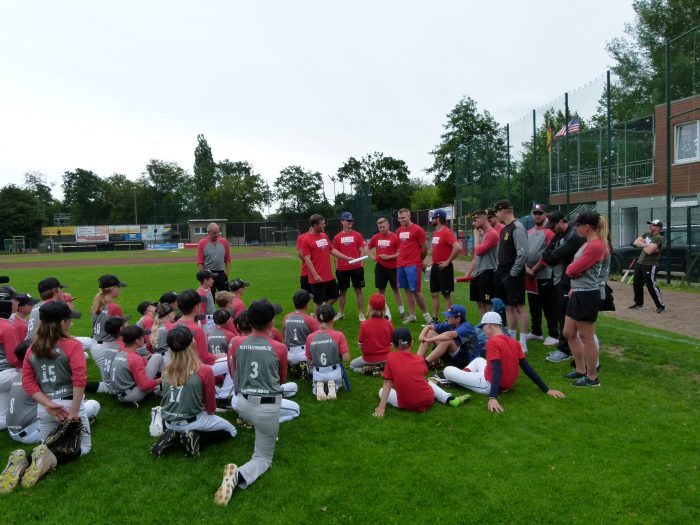 50 Mädchen und Jungen toben bei strahlendem Sonnenschein über den Baseballplatz. Die einen absolvieren Laufübungen, die nächsten werfen in hohem…