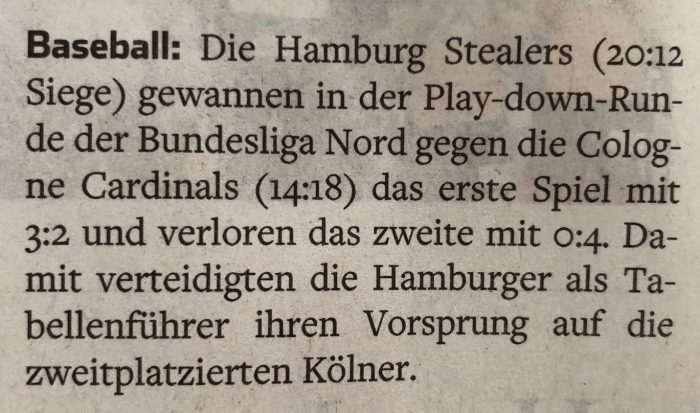 Die Hamburg Stealers erreichten am zweiten Doppelspieltag der Play-down-Runde in der Baseball-Bundesliga eine Siegteilung gegen die Cologne Cardinals. Dem 3:2-Erfolg…
