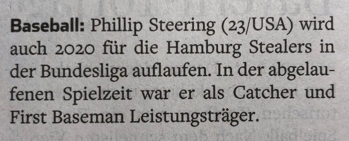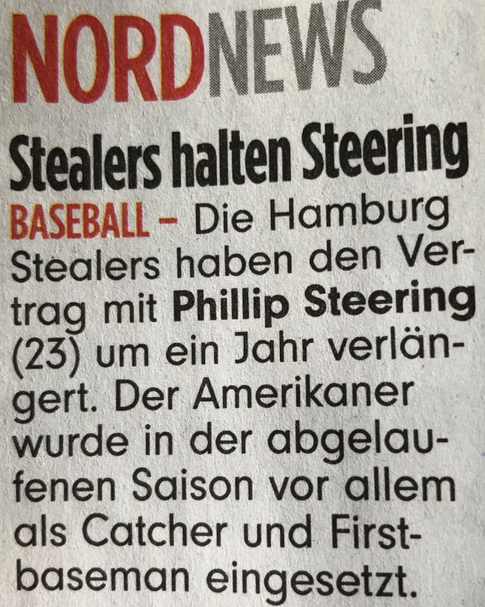 Die Hamburg Stealers haben in ihrer Personalplanung für die Baseball-Bundesligasaison 2020 einen weiteren wichtigen Erfolg verbucht. Der US-Amerikaner Phillip Steering…