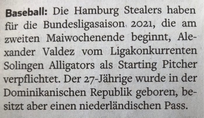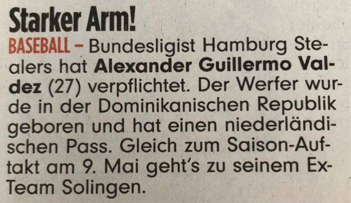 Die Hamburg Stealers haben sich für die diesjährige Saison in der Baseball-Bundesliga mit dem 27 Jahre alten Alexander Guillermo Valdez…
