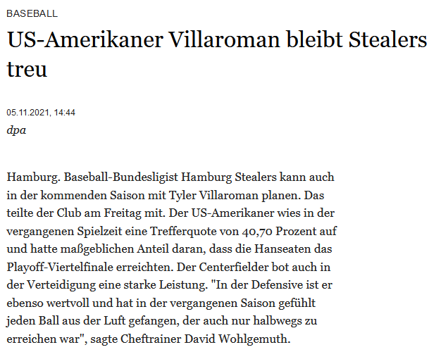 Die Hamburg Stealers können auch in der kommenden Saison der Baseball-Bundesliga auf einen ihrer wichtigsten Leistungsträger setzen. Centerfielder Tyler Villaroman…
