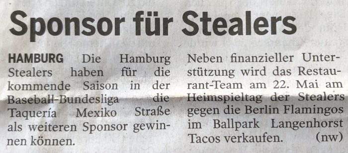 Die Hamburg Stealers haben für die kommende Saison in der Baseball-Bundesliga die Mexiko Strasse als weiteren Sponsor gewinnen können. Das…
