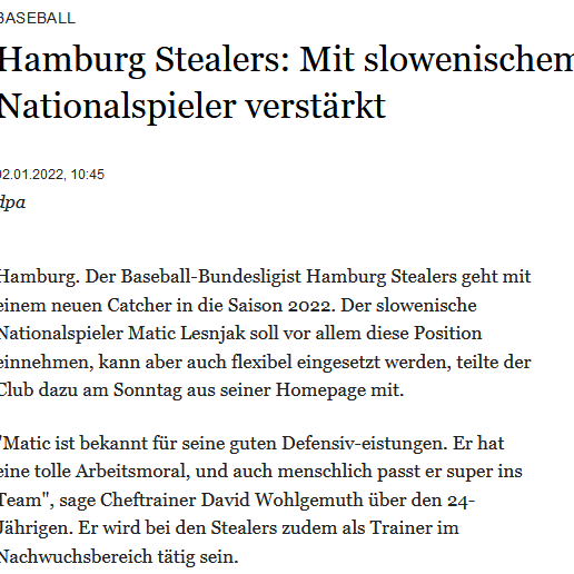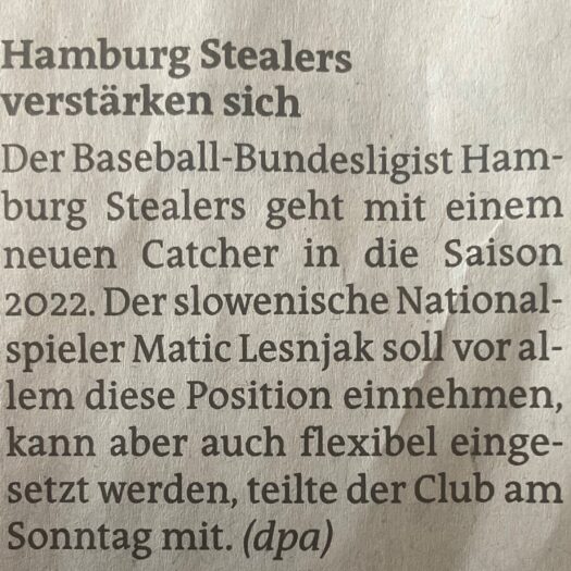 DetailsDie Hamburg Stealers verstärken sich für die Saison 2022 in der Baseball-Bundesliga mit Matic Lesnjak. Der slowenische Nationalspieler wird vorrangig…