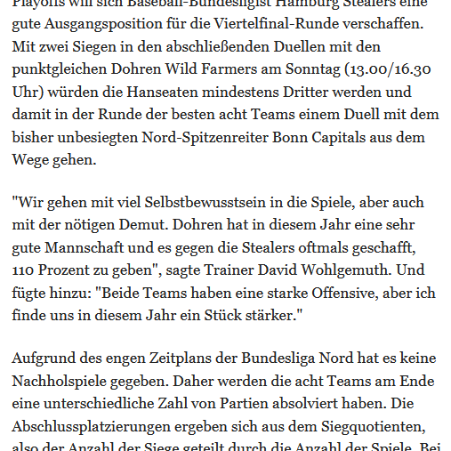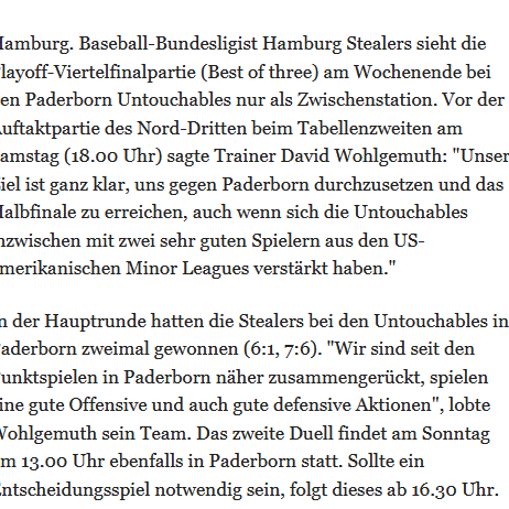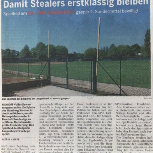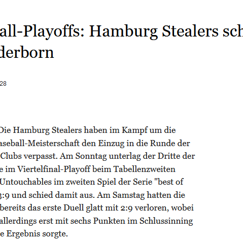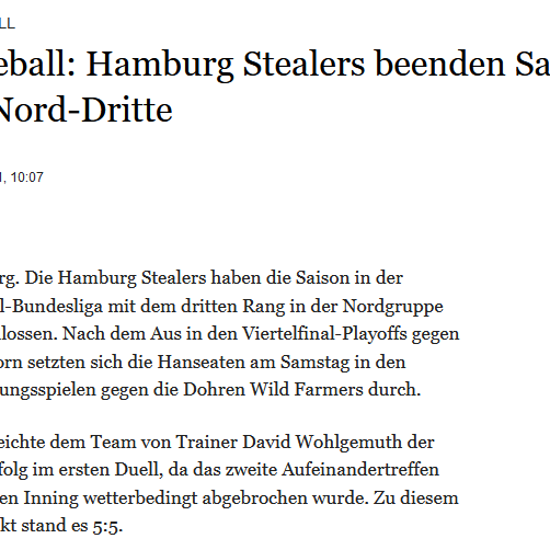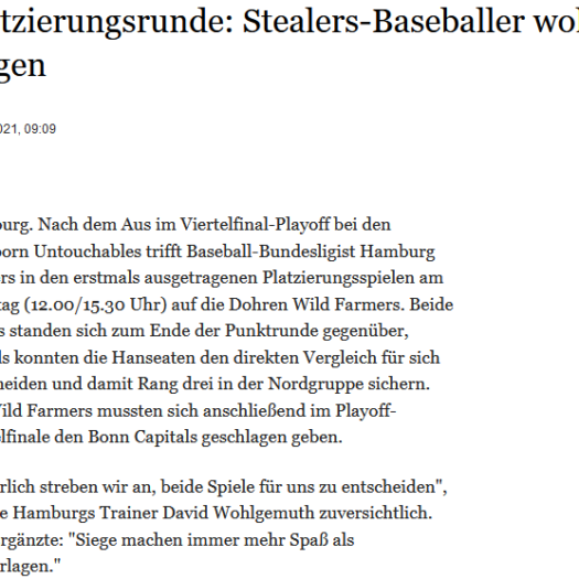 Baseball-Bundesliga Nord, Play-off-Platzierungsrunde: Hamburg Stealers – Dohren Wild Farmers 13:2; Spiel 2 bei 5:5 abgebrochen. Die Hamburg Stealers haben sich…