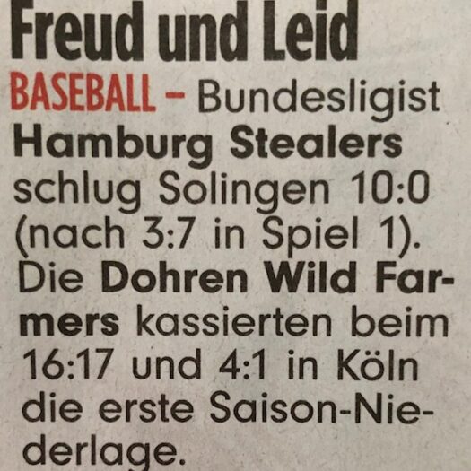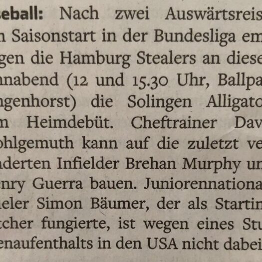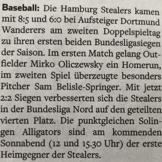 DetailsDie Hamburg Stealers haben in der Baseball-Bundesliga am zweiten Doppelspieltag ihre ersten beiden Saisonsiege gefeiert. Bei den Dortmund Wanderers kam…