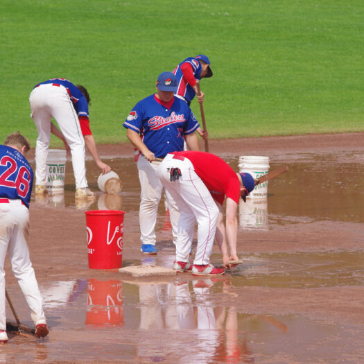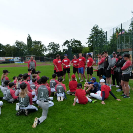 50 Mädchen und Jungen toben bei strahlendem Sonnenschein über den Baseballplatz. Die einen absolvieren Laufübungen, die nächsten werfen in hohem…