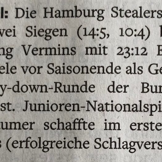 DetailsDie Hamburg Stealers gewannen am Sonnabend ihre beiden Bundesligaspiele bei den Wesseling Vermins verdient mit 15:4 und 10:4 und sicherten…