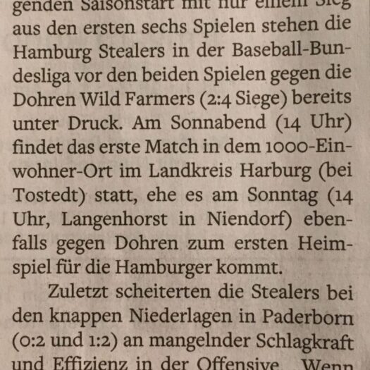 DetailsErneut zwei Auswärtsspiele stehen für die Hamburg Stealers an diesem Sonnabend (12 und 15.30 Uhr) in der Baseball-Bundesliga an. Nach…
