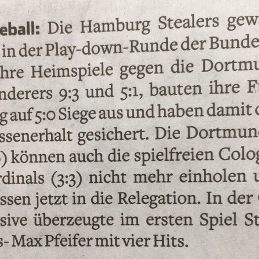 DetailsDie Hamburg Stealers dominieren weiterhin die Play-down-Runde der Baseball-Bundesliga Nord und kamen am Sonnabend mit 9:3 und 5:1 zu zwei…