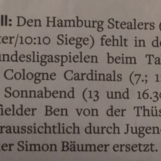 DetailsDie Hamburg Stealers weisen erstmals in der Bundesligasaison 2017 eine positive Sieg-Bilanz (12:10) auf. Entscheidend dafür waren am Sonnabend die…