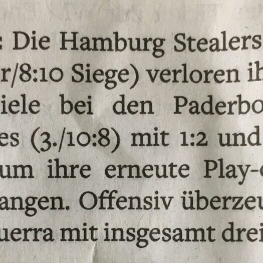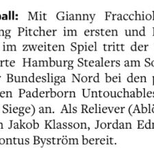 DetailsDie Hamburg Stealers mussten am Sonntag in der Baseball-Bundesliga zwei schmerzhafte Niederlagen hinnehmen. Bei den bis dahin punktgleichen Paderborn Untouchables…