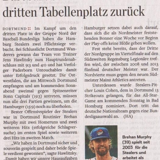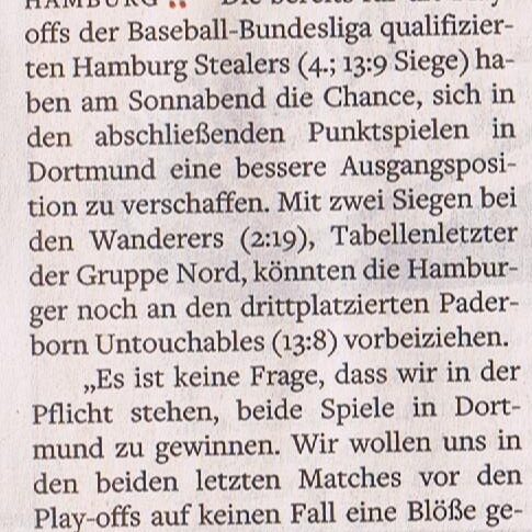 DetailsDie Hamburg Stealers haben in den letzten beiden Spielen vor dem Play-off-Viertelfinale der Baseball-Bundesliga ihre Pflichtaufgabe erfüllt und bei den…