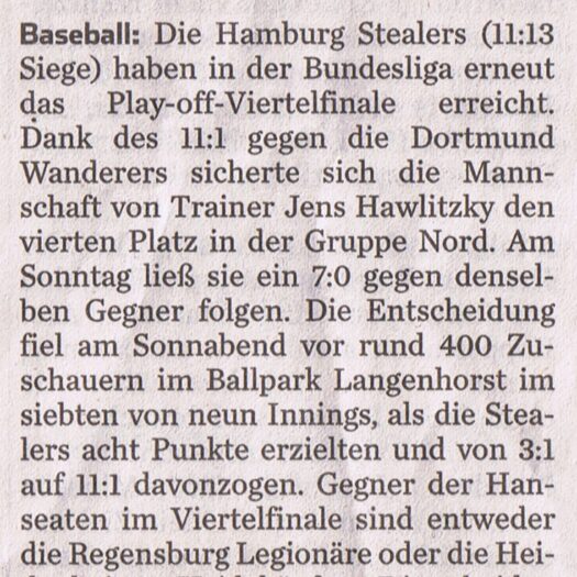 DetailsDer Spielplan der Baseball-Bundesliga hätte für die Hamburg Stealers kaum besser aufgestellt werden können. Am kommenden Wochenende bestreitet das Team…