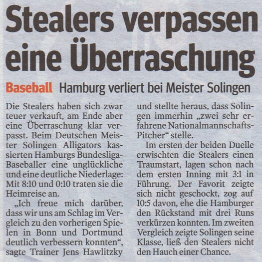 DetailsMit einer unglücklichen und einer klaren Niederlage beim Deutschen Meister Solingen Alligators mussten die Bundesliga-Baseballer der Hamburg Stealers am Freitag,…